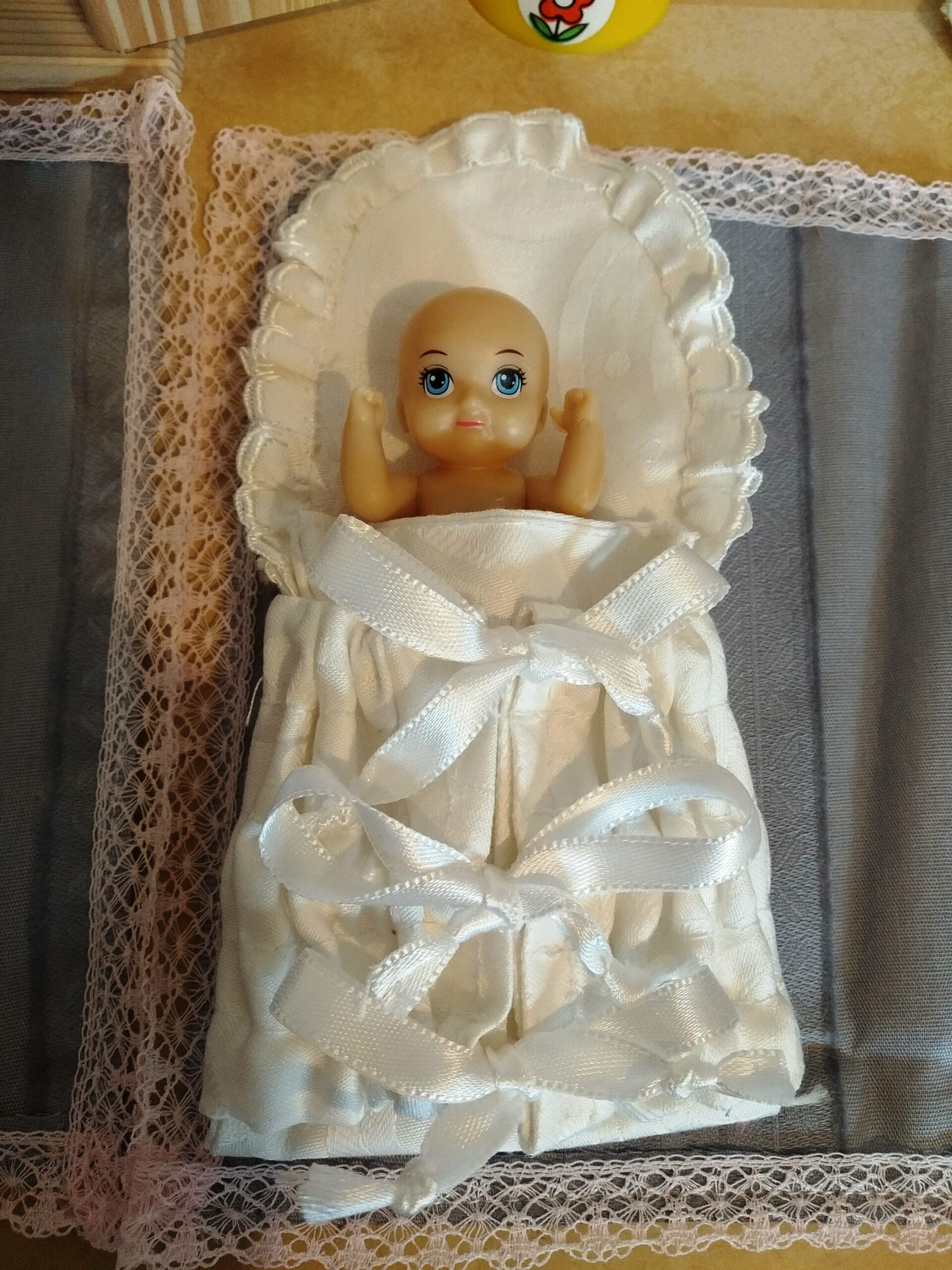 Zavinovačka pro malé panenky žluto-bílá s krajkou Každá zavinovačka je jiná, ale všechny jsou ušity ze stejné látky. vhodná k malé panence Igra délka v…