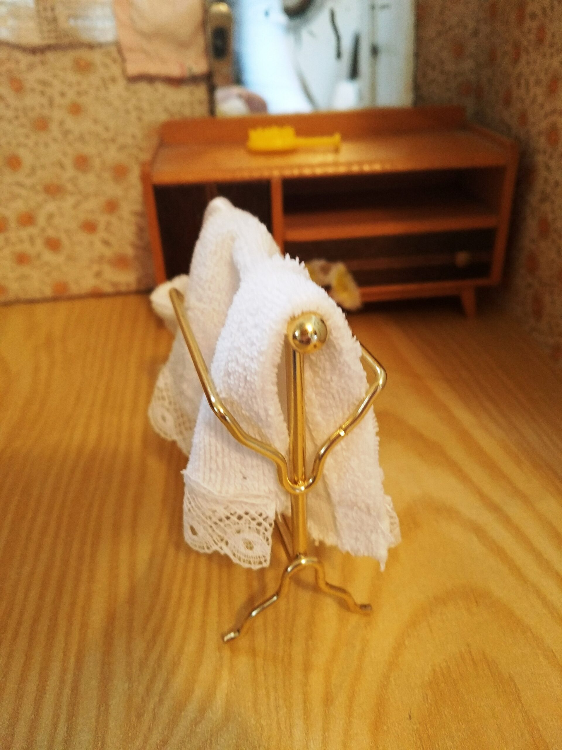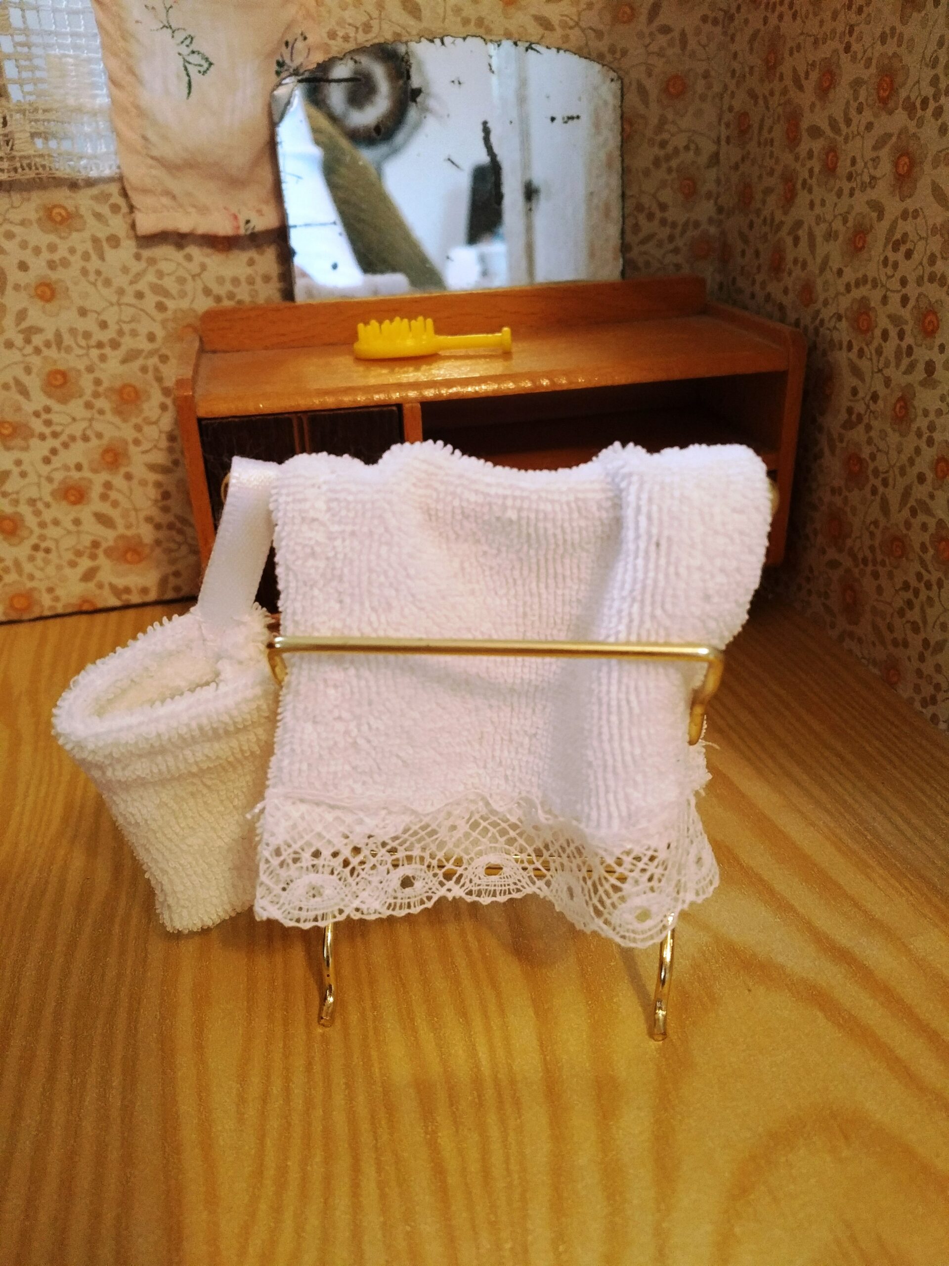Záclonka do domečku pro panenky šířka: 15,5 cm délka: 13 cm Prodáváme 2 kusy, které se liší jen barvou korálků na konci konzole – růžové a žluté.…