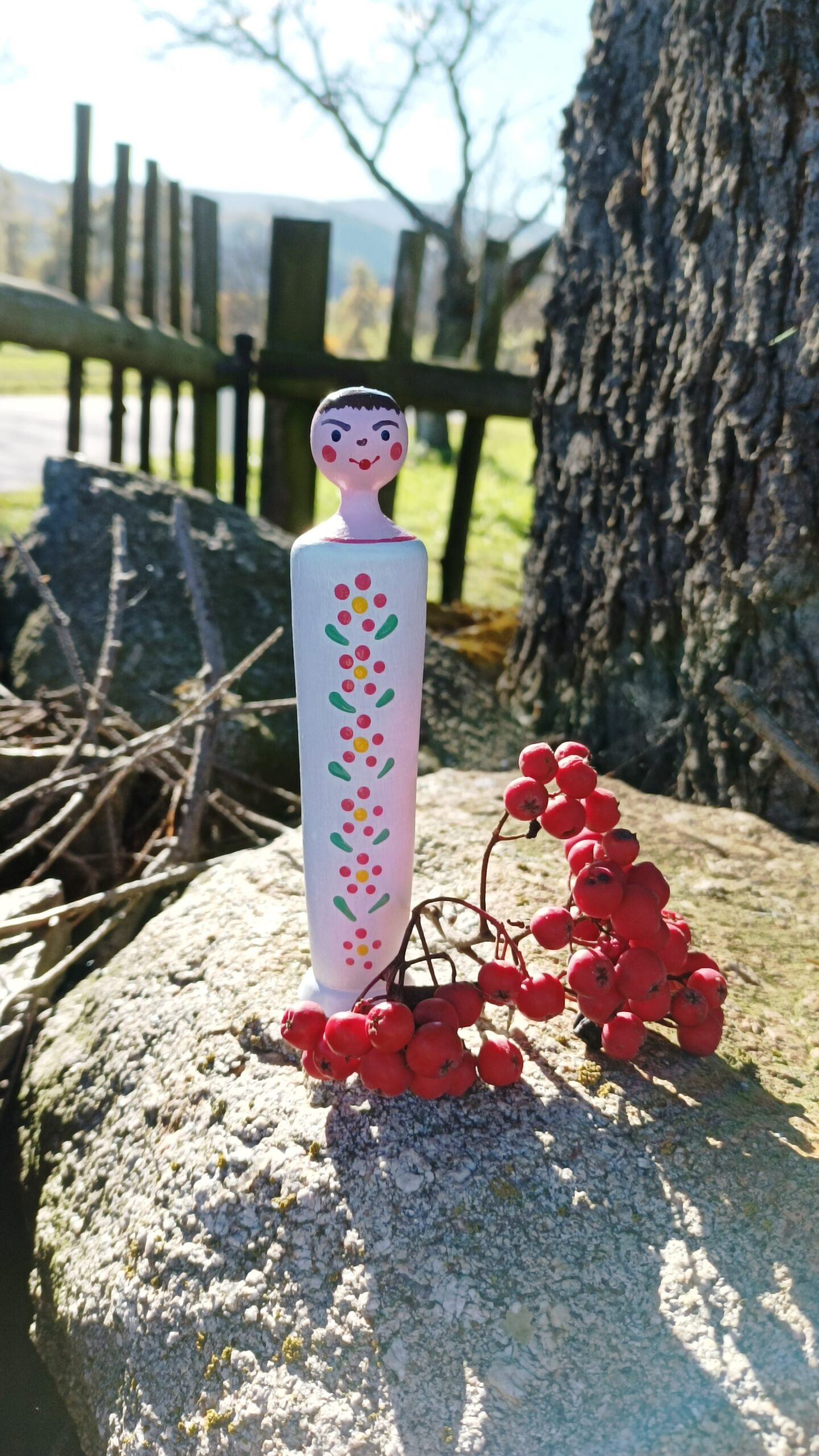 Ručně malovaná dřevěná panenka výška: 14,4 cm Krásná originální panenka, vhodná do tradiční selské jizby i jako hezká dekorace. Vyrobena tradičními postupy v Čechách.
