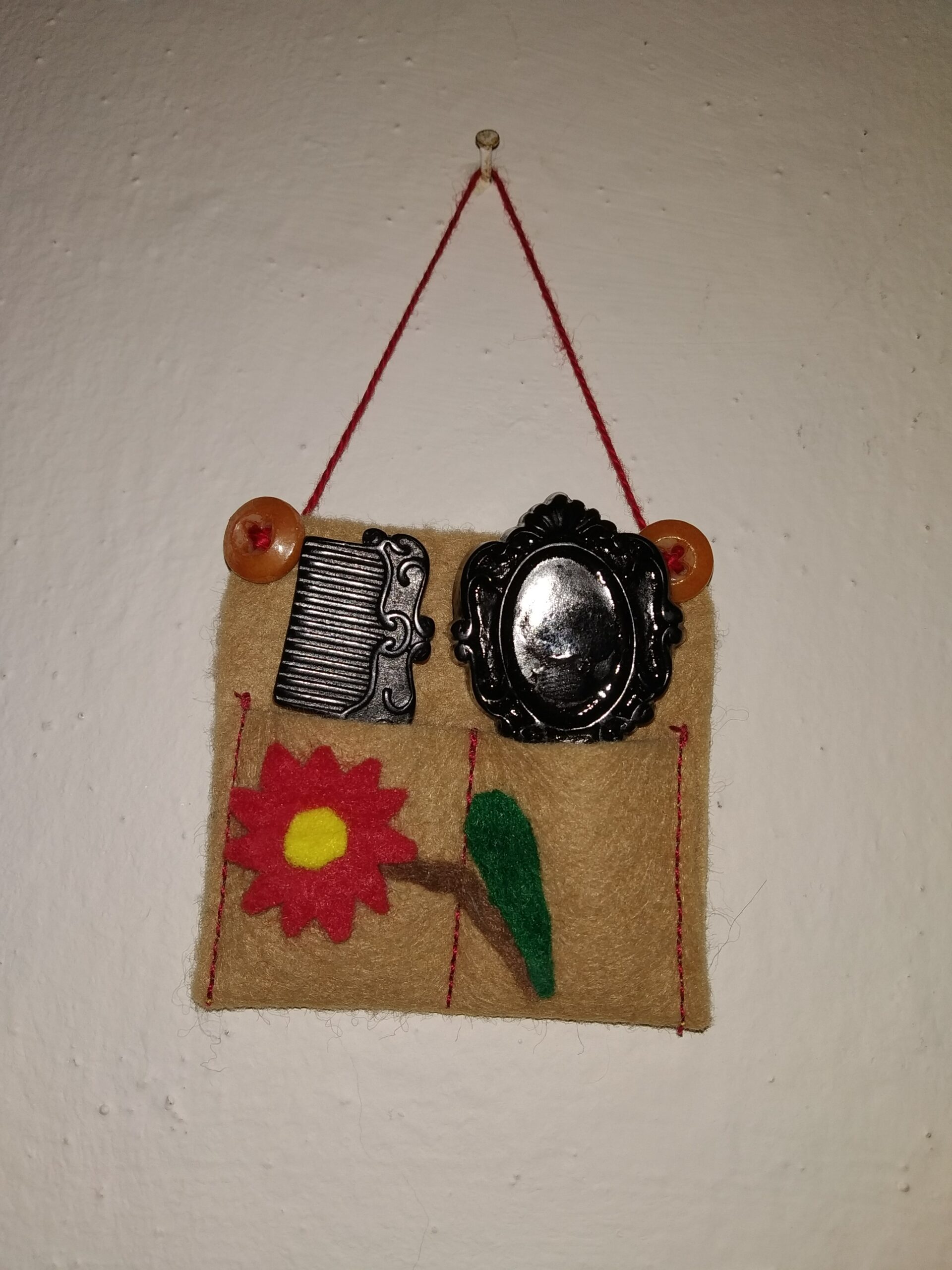 Zrcátko a hřebínek jsou dekorační, s hřebínkem se nedá česat, zrcátko viz foto, jen naznačené.