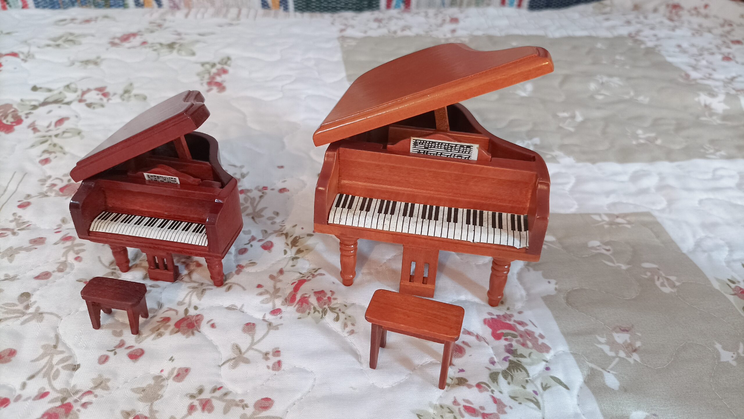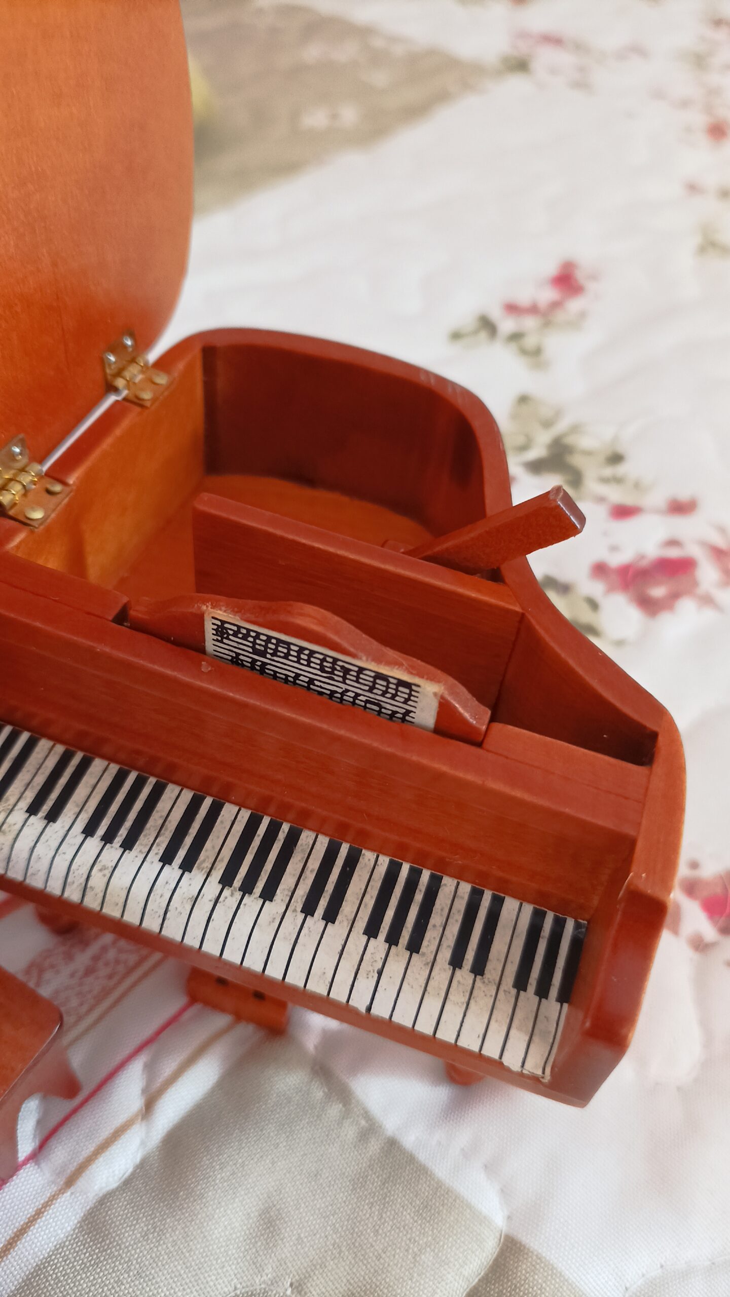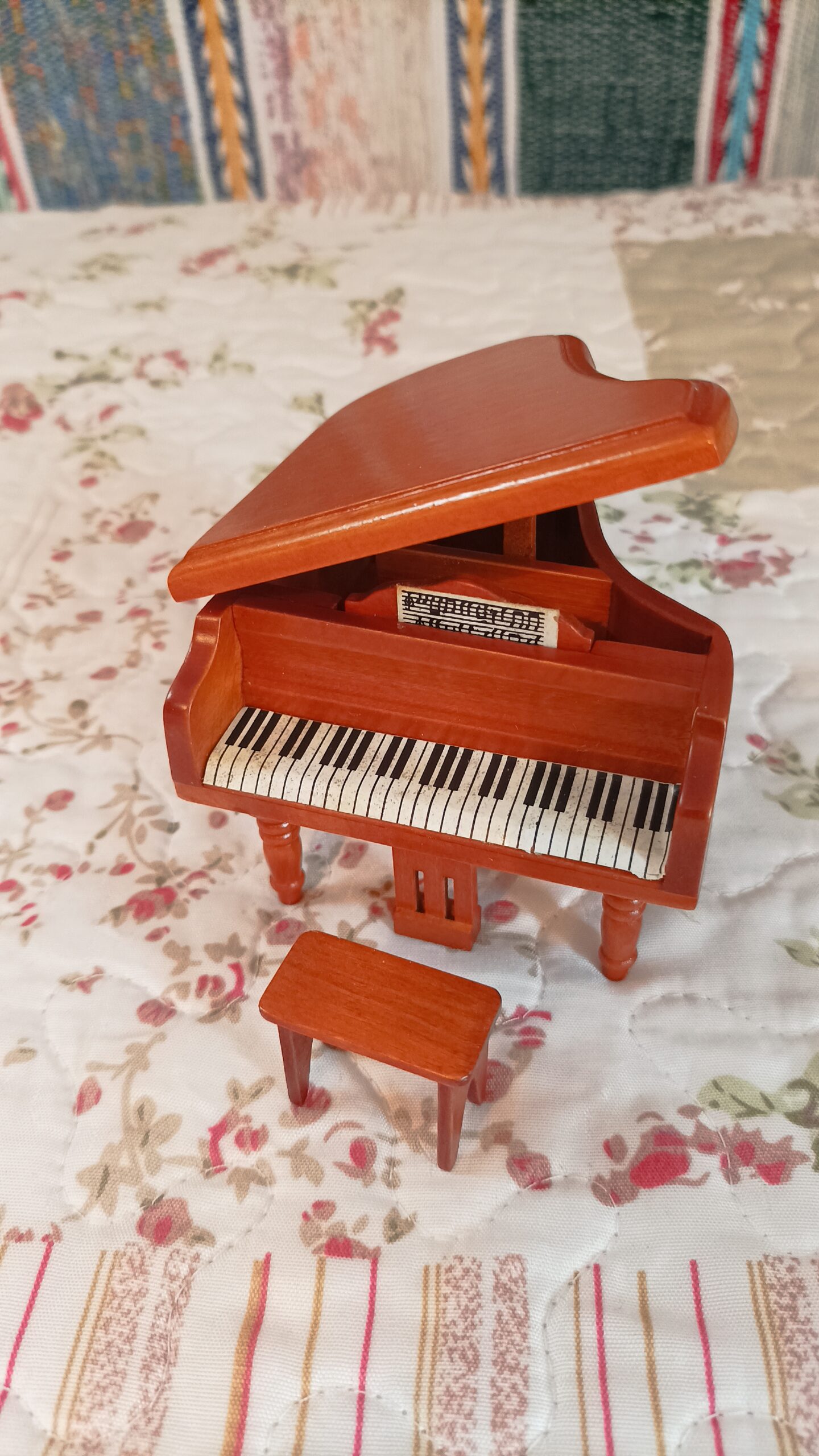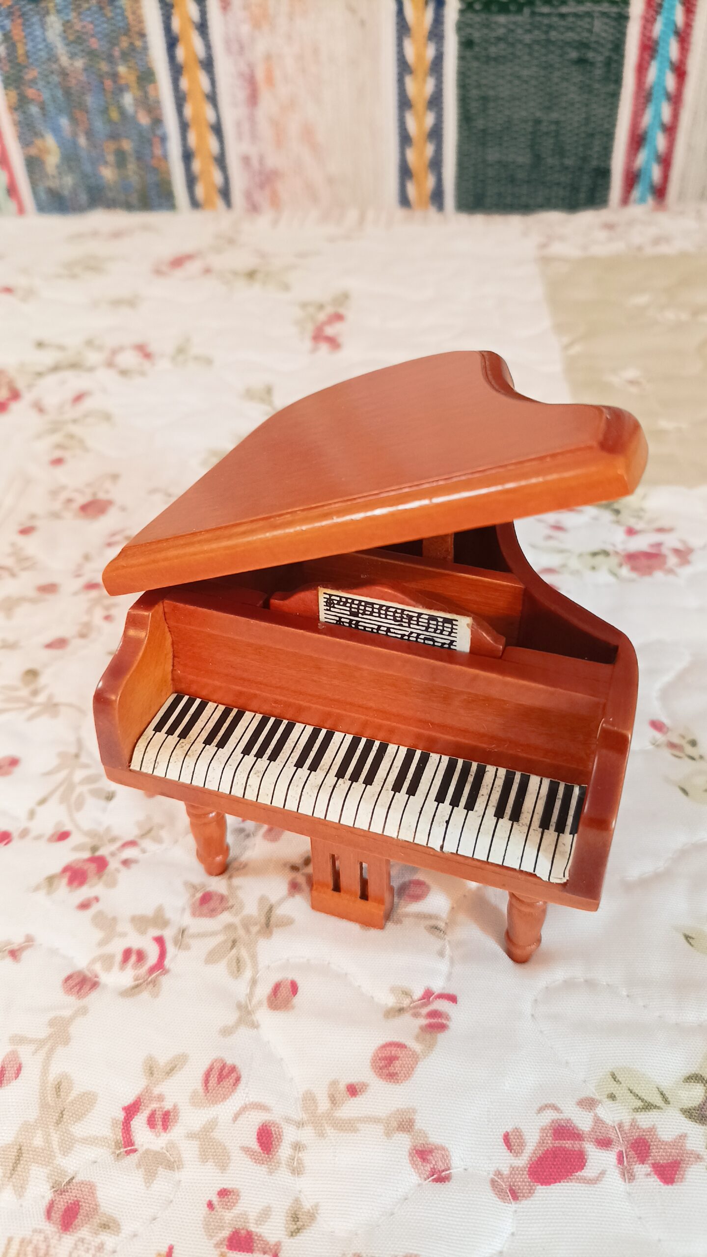 Krásný klavír, jehož křídlo se dá podepřít, stejně jako u toho skutečného.