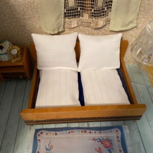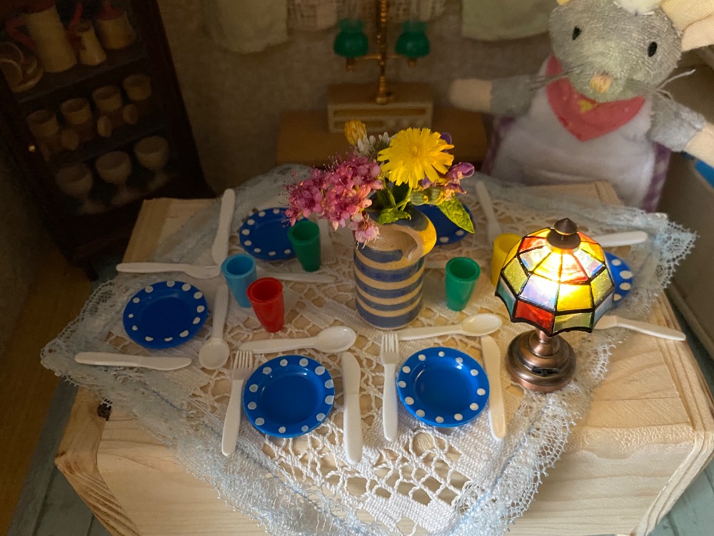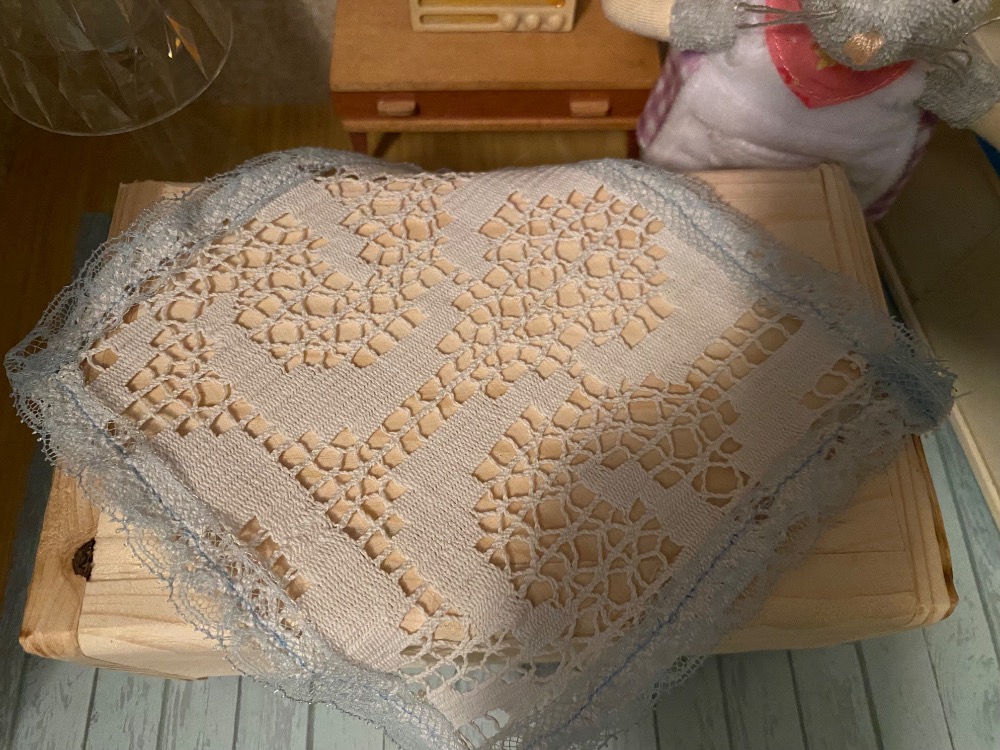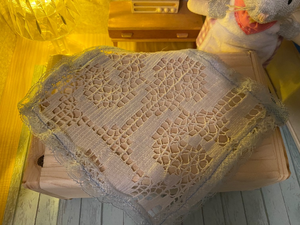 Dnes ušila tento krajkový ubrus a olemovala ho modrou mašličkou.