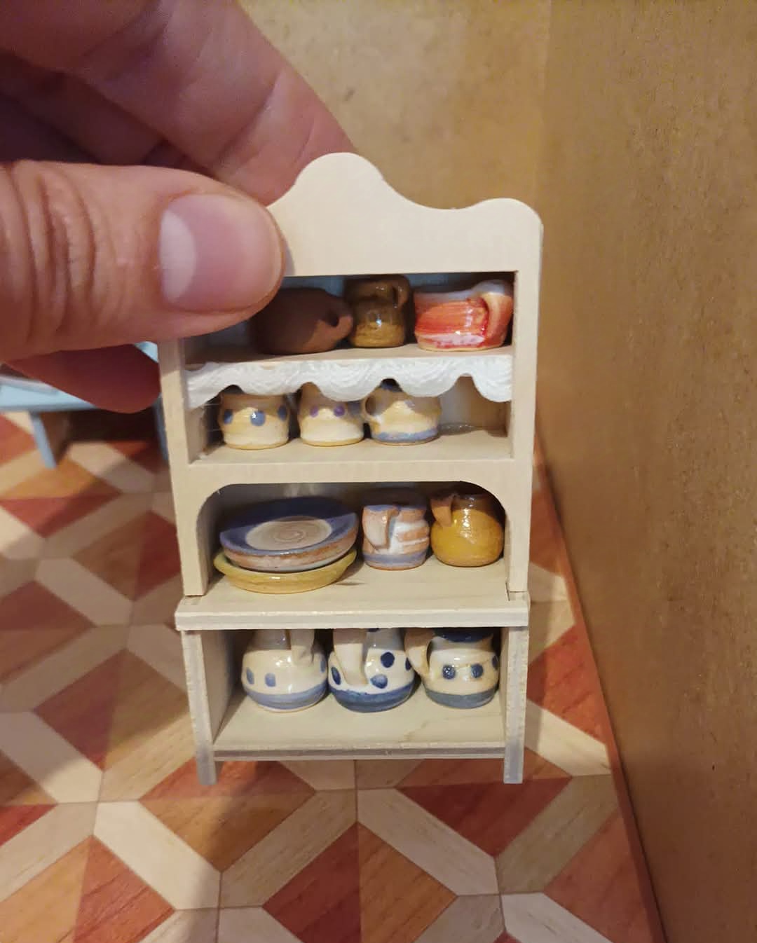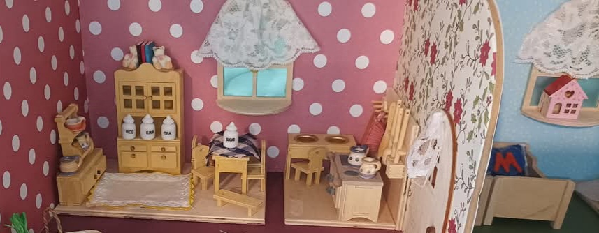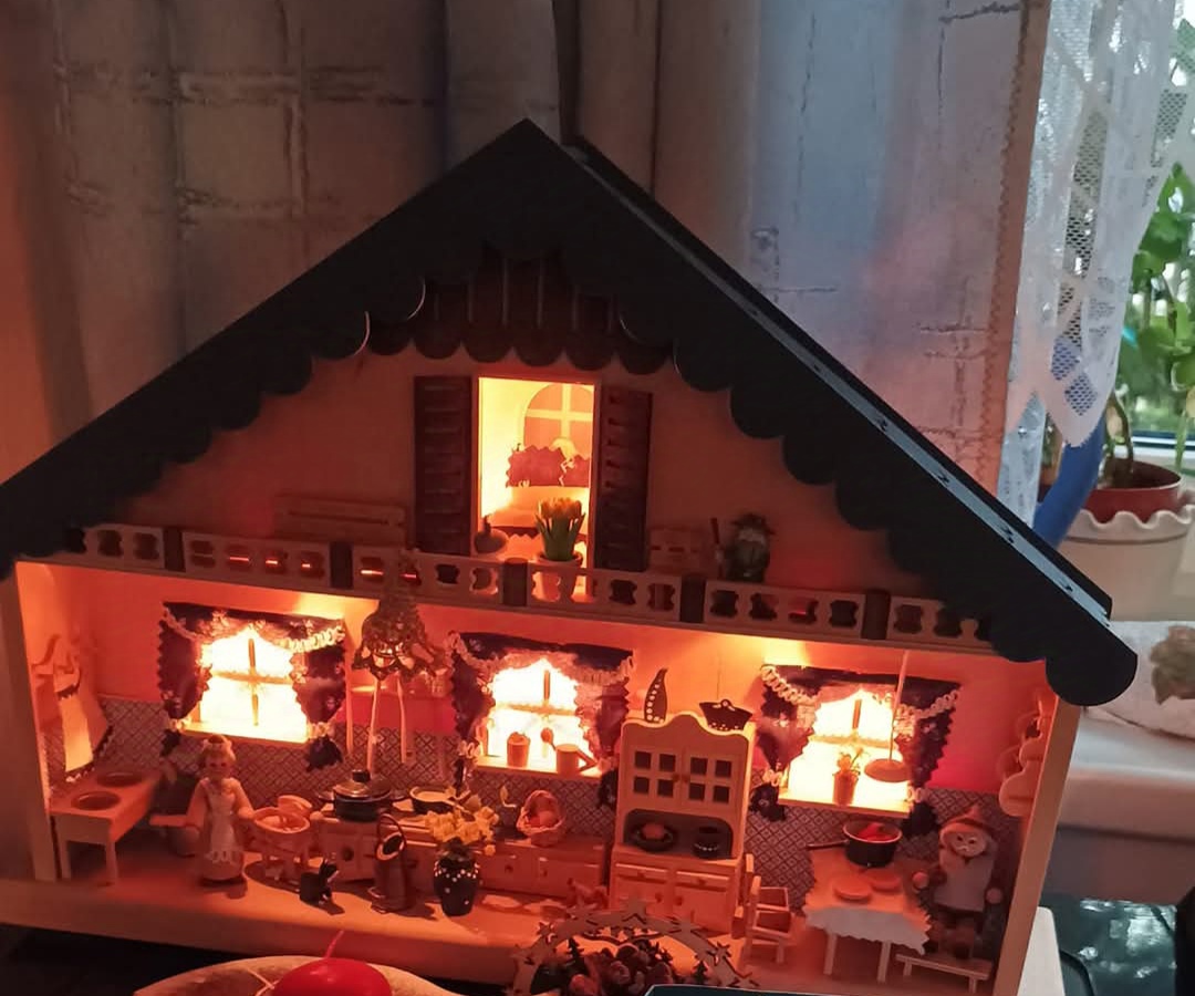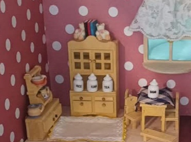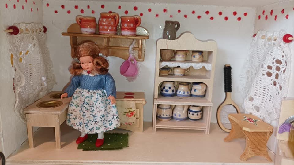 Výstavní koutek / Pokojíček K vlastnímu vytapetování, dozdobení a zařízení. Je to ten s koupelnou. délka: 28 cm výška: 20,5 cm poloměr: 31,2 cm materiál:…