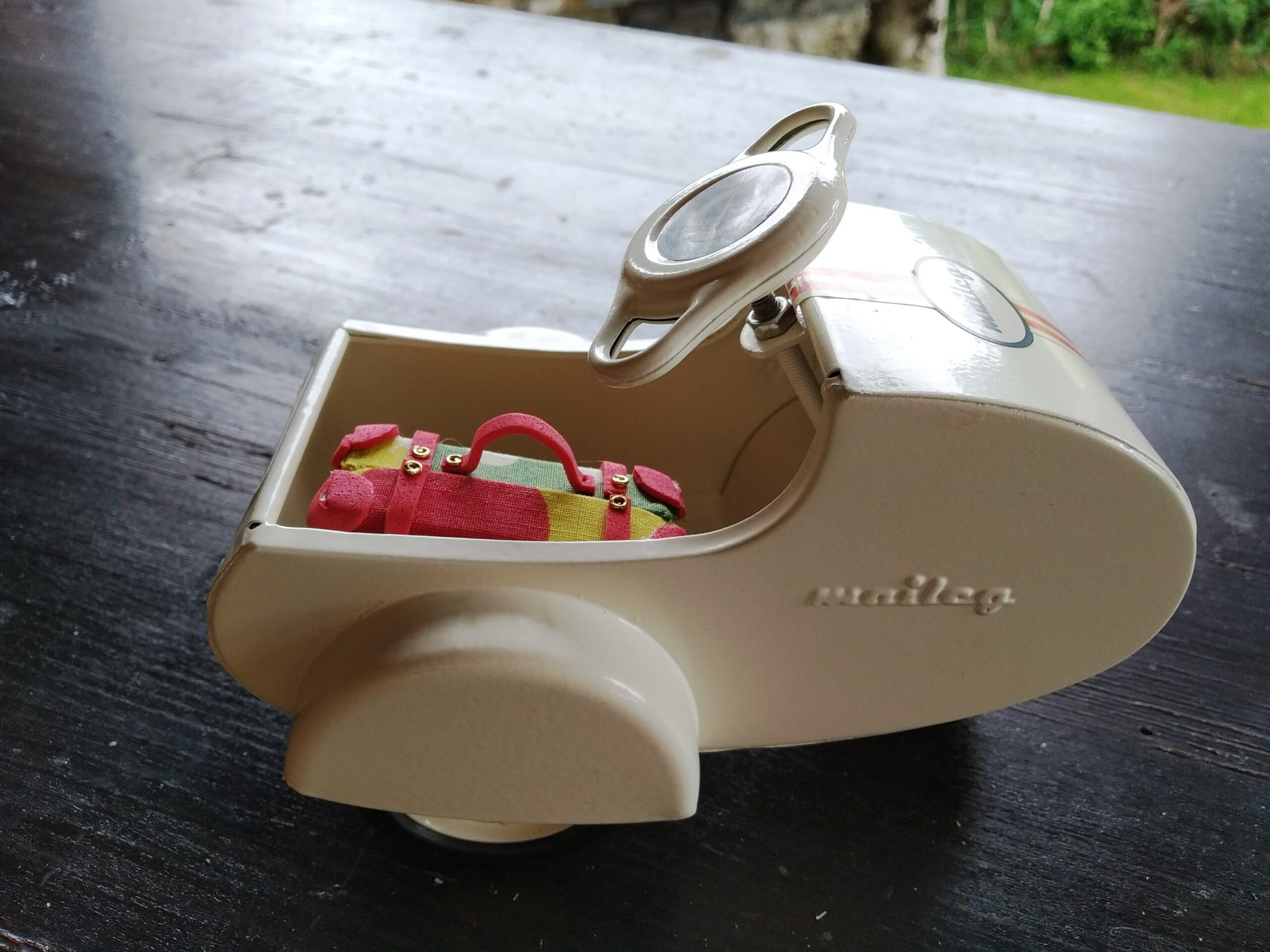 dřevěný kočárek s polštářkem a peřinkou Kolečka jsou pohyblivá. délka: 9 cm včetně madla výška: 6,5 cm foceno s malinkou panenkou – 4,5 cm Panenka…