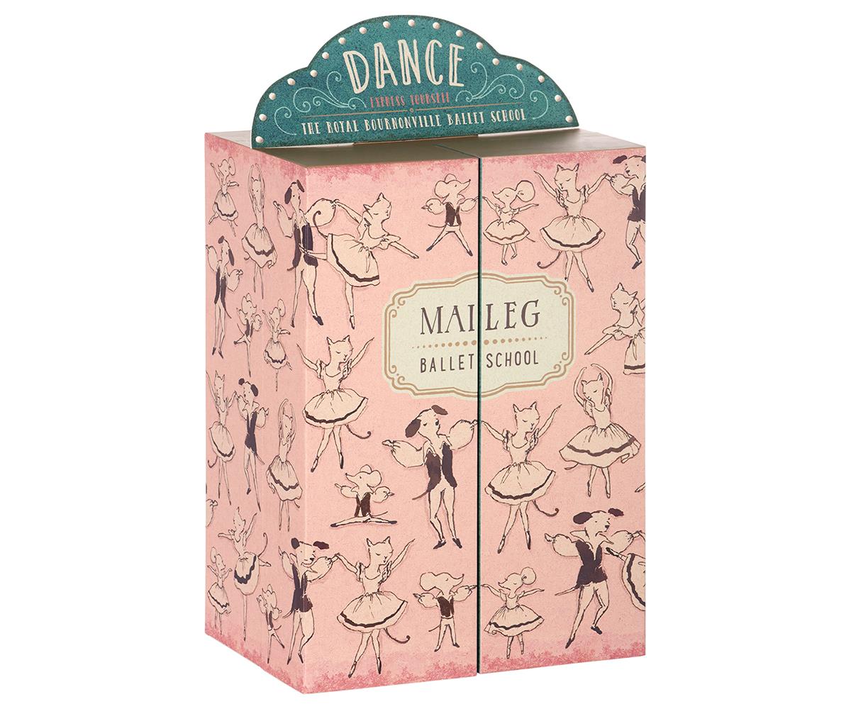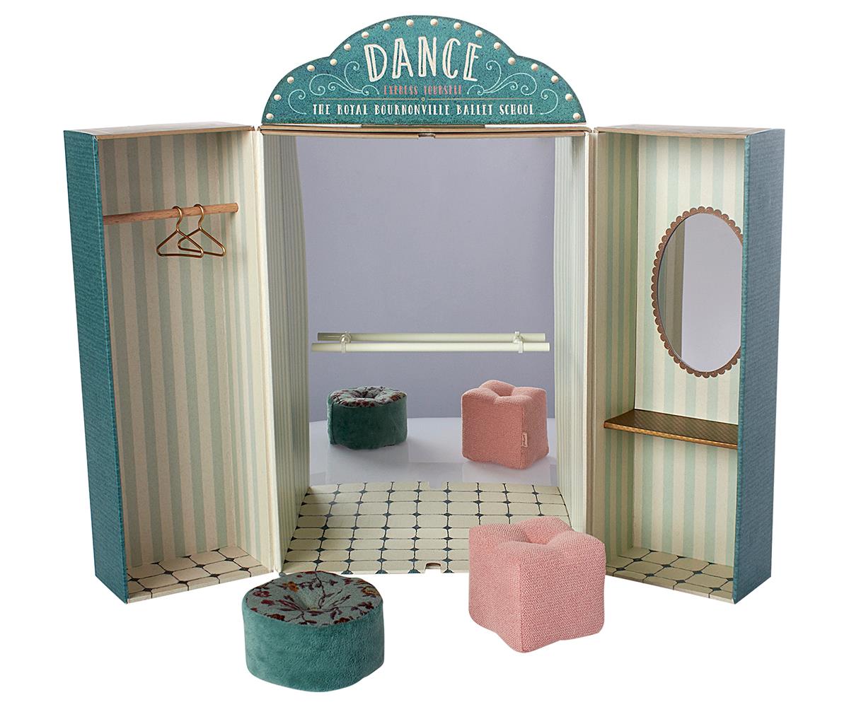 Při rozevření je po celé zadní stěně zrcadlo a na zadní stěně je baletní tyč (madlo pro baletky).