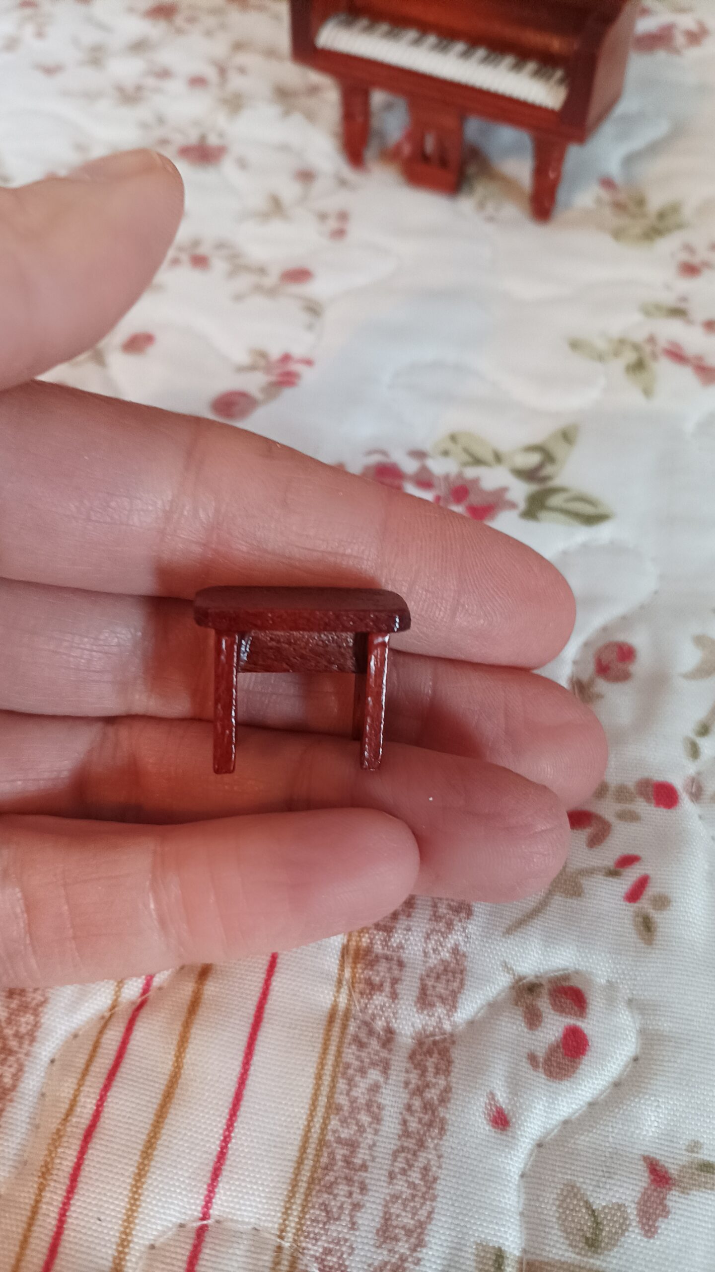 Má odklápěcí křídlo, sklápěcí stojánek na noty a úplně malou stoličku, která měří jen 2,2 cm.
