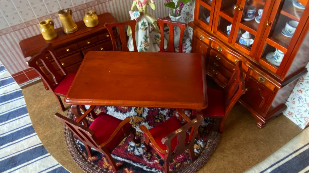 Větší obdélníkový stůl a 6 židliček.