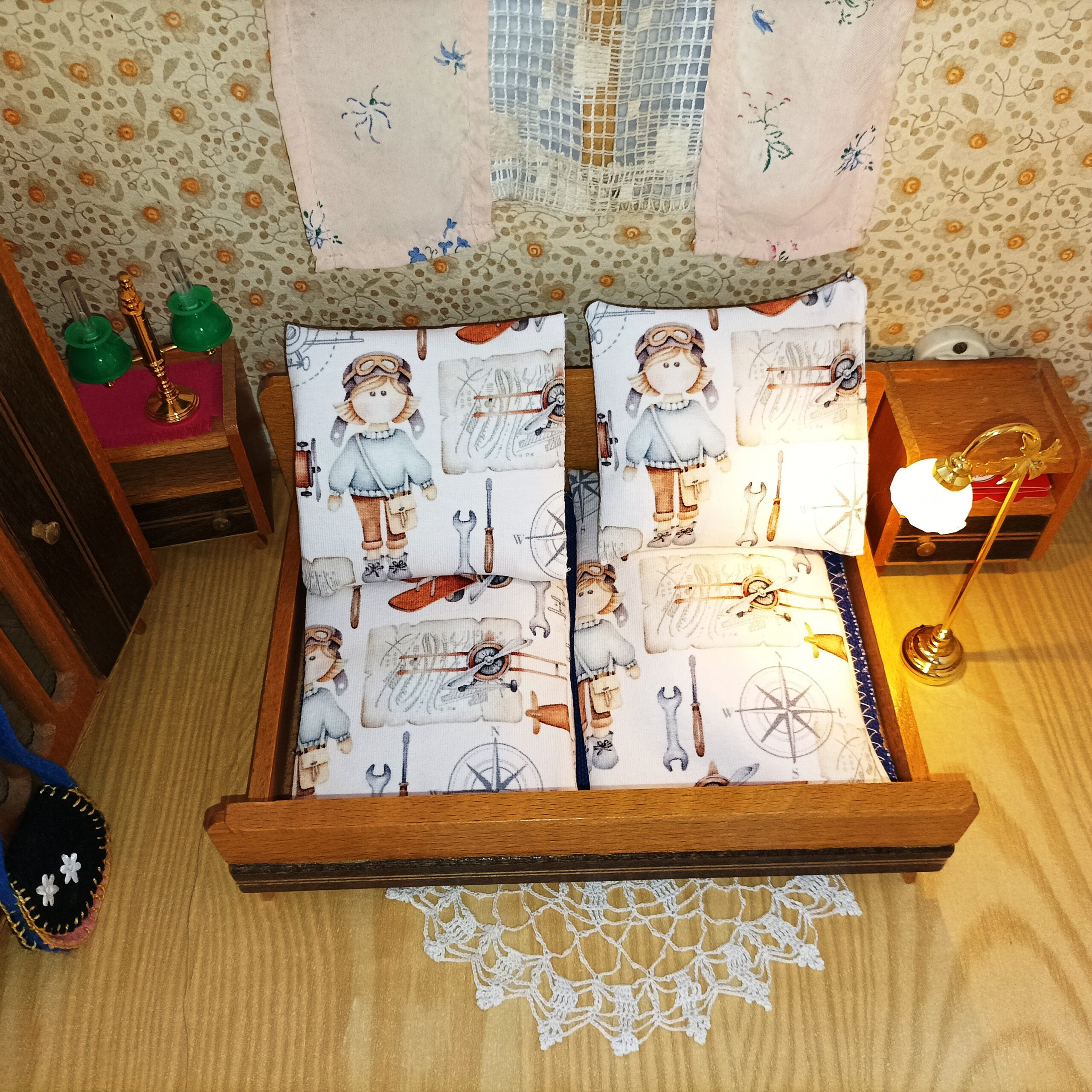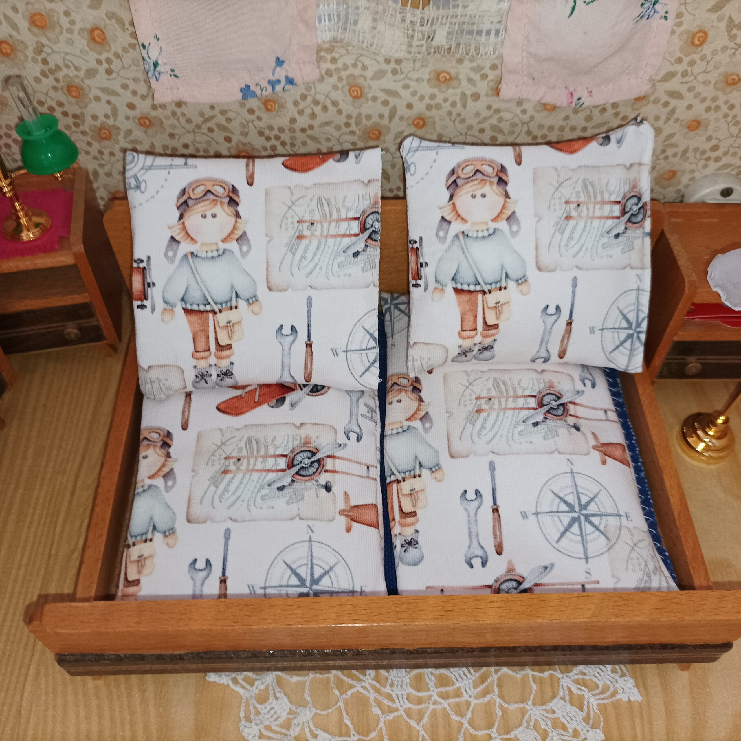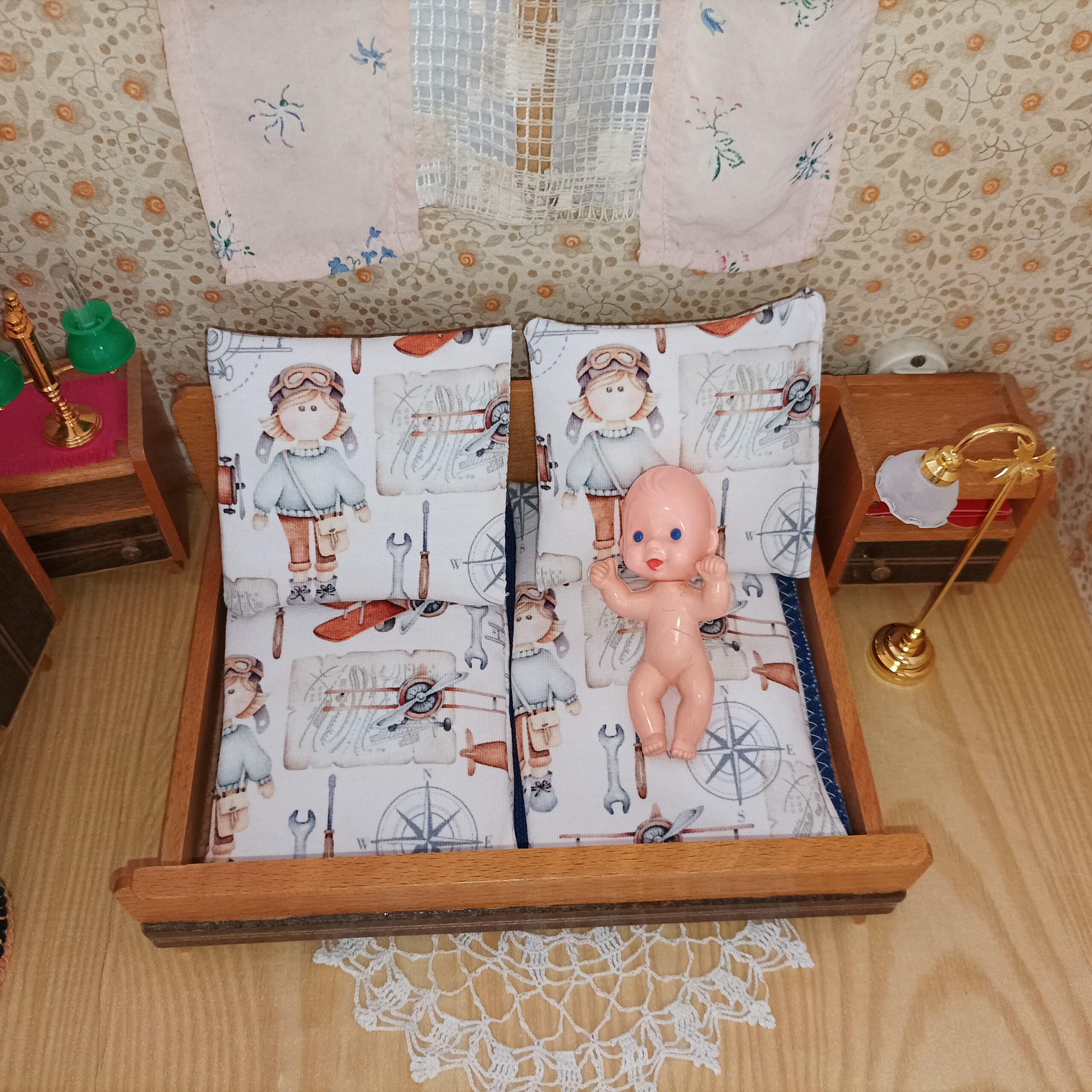 Postýlka pro ilustraci měří 12 x 16.5 cm. 12 cm je rozměr tak, jak panenka leží, 16,5 cm je šíře.