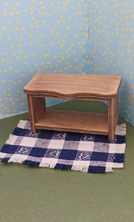 Jednoduchá malá lavička s prvky dřevořezby délka: 8,2 cm hloubka sedací plochy: 1,5 cm Na sedací části jsou malé stopy po lepidle.