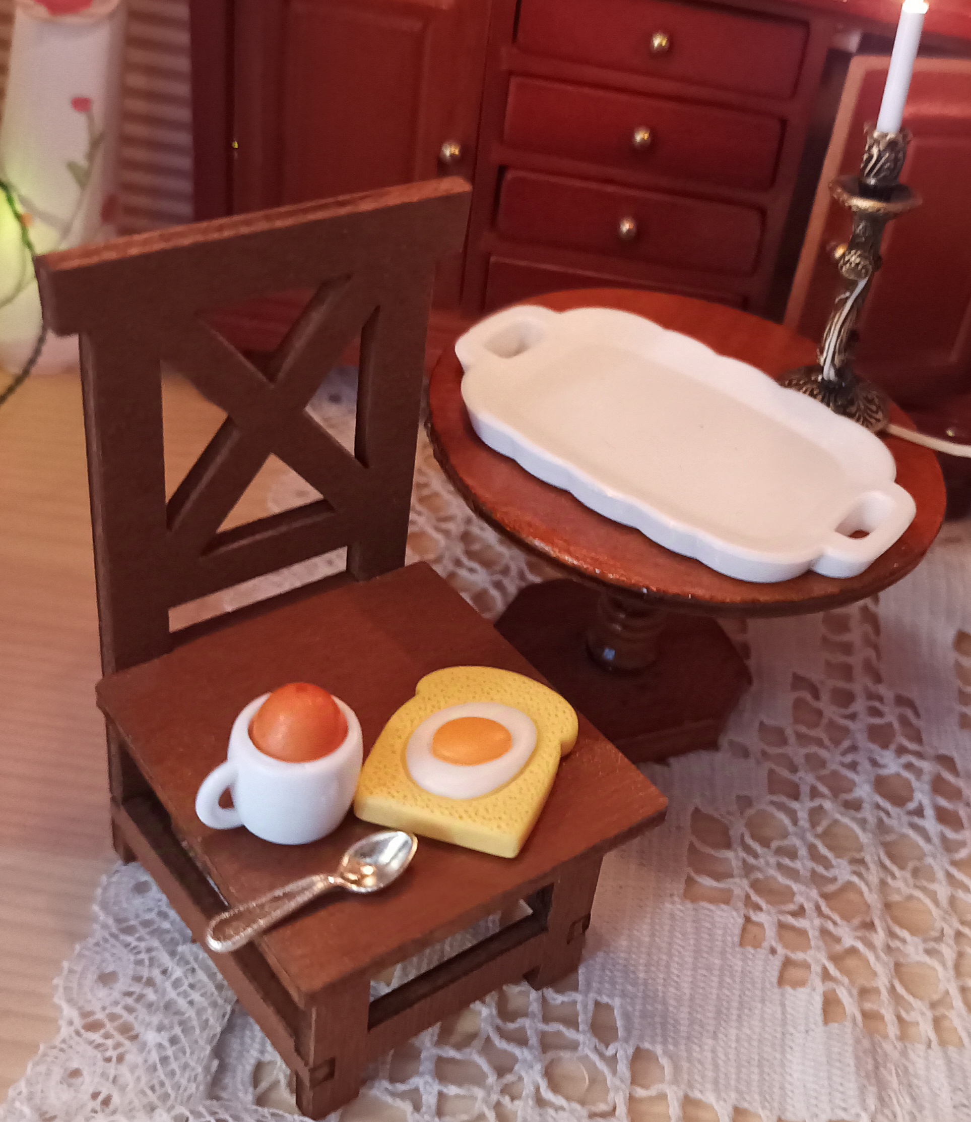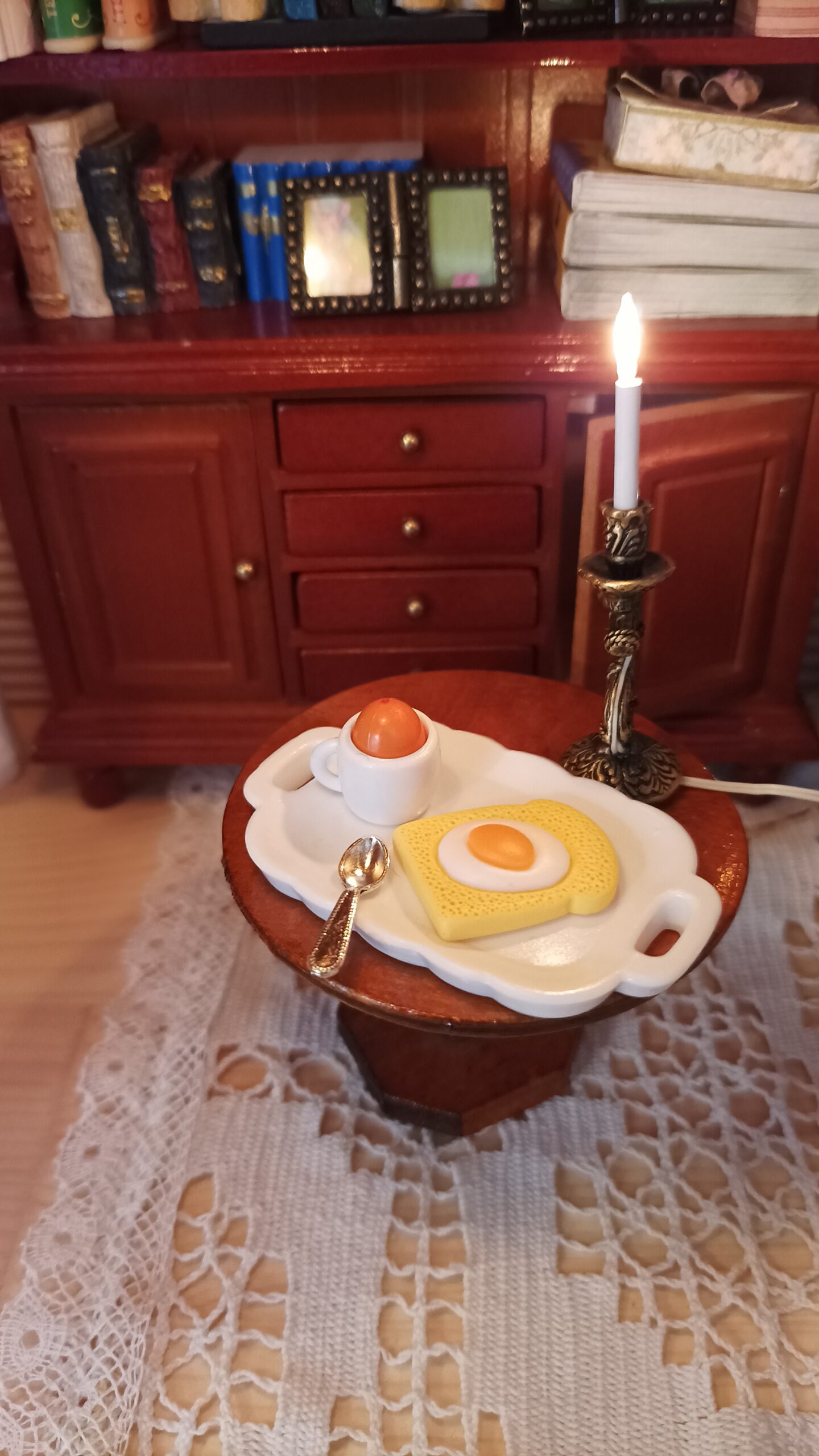 Set obsahuje plastový tác, kalíšek s vajíčkem, toast s volským okem a malou lžičku.