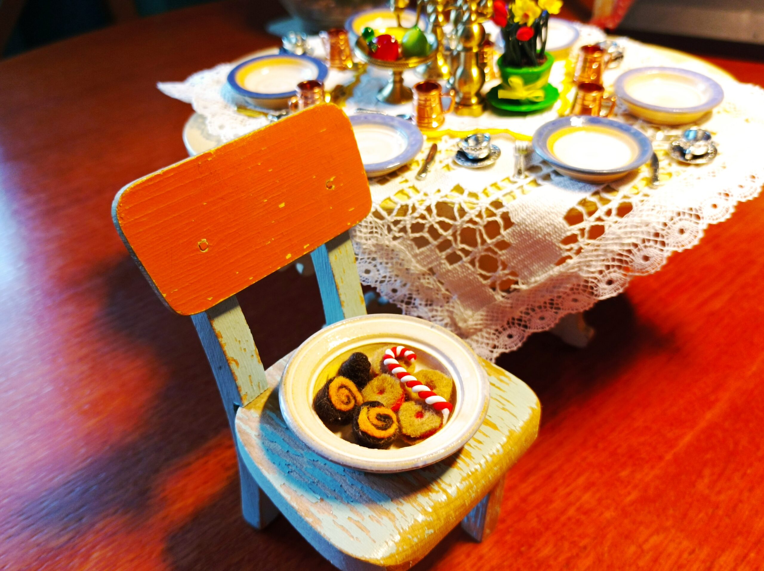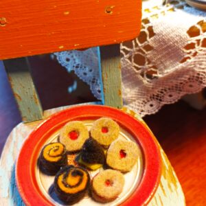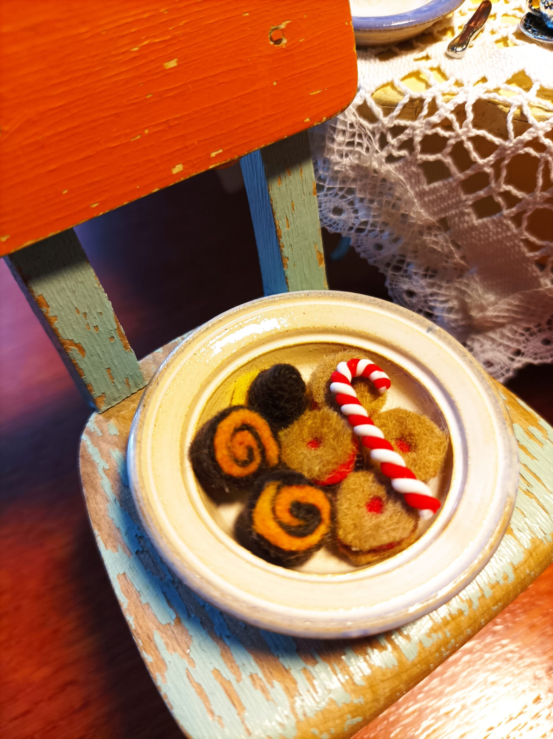 Cukroví je vyrobeno z filce a hůlka z polymeru. Na talířku je volně položeno.