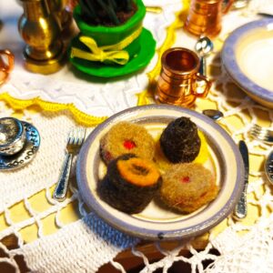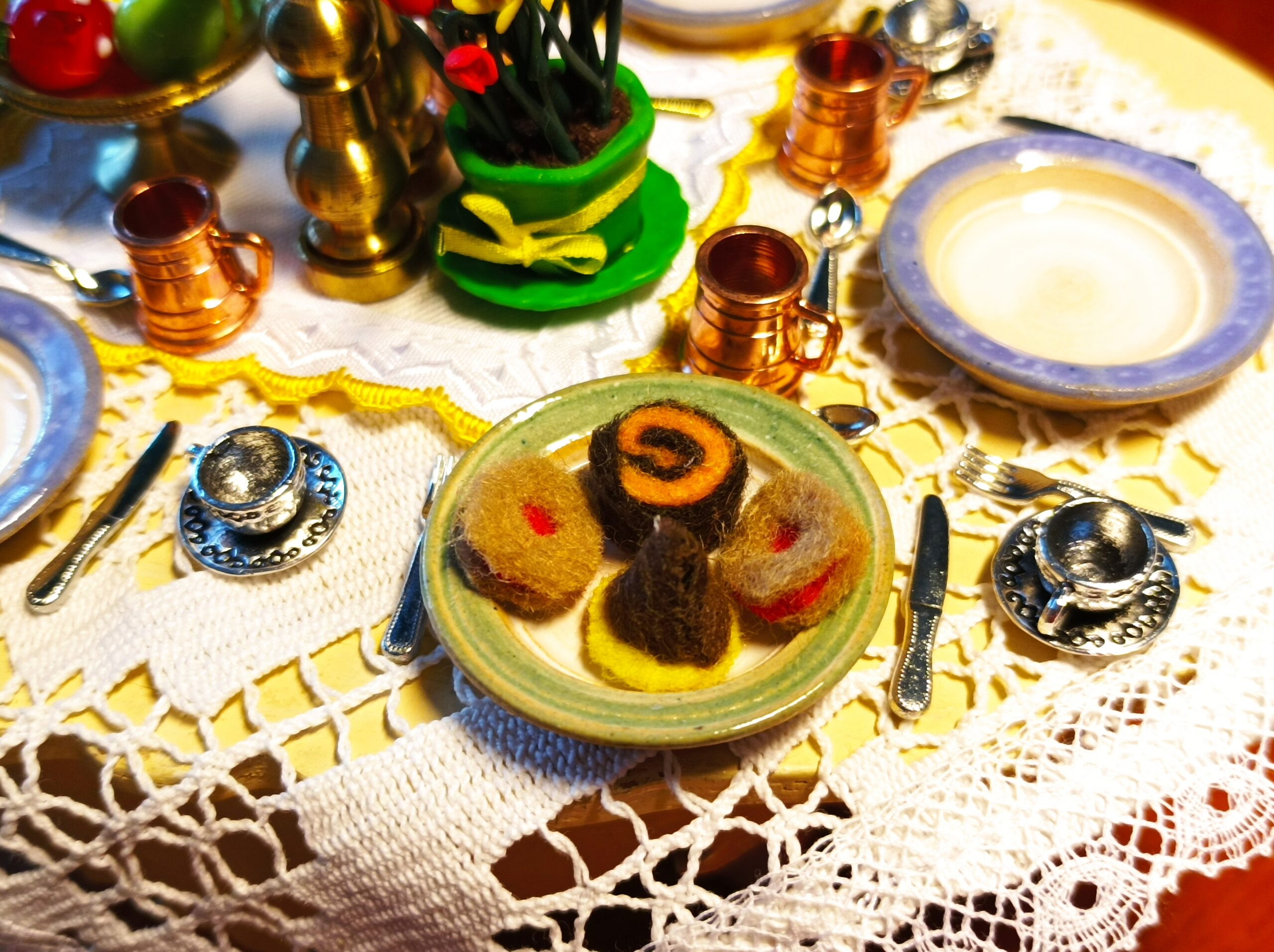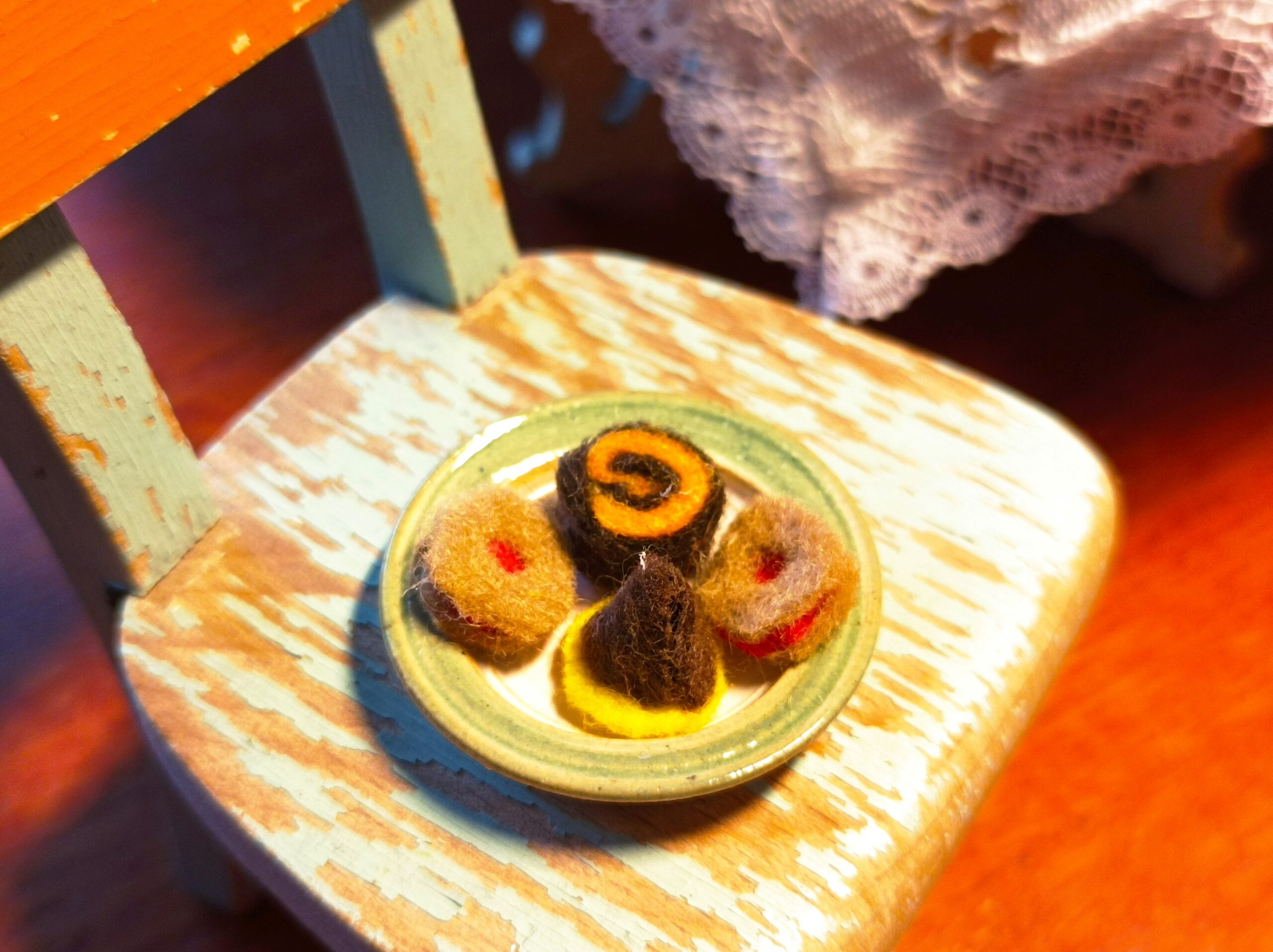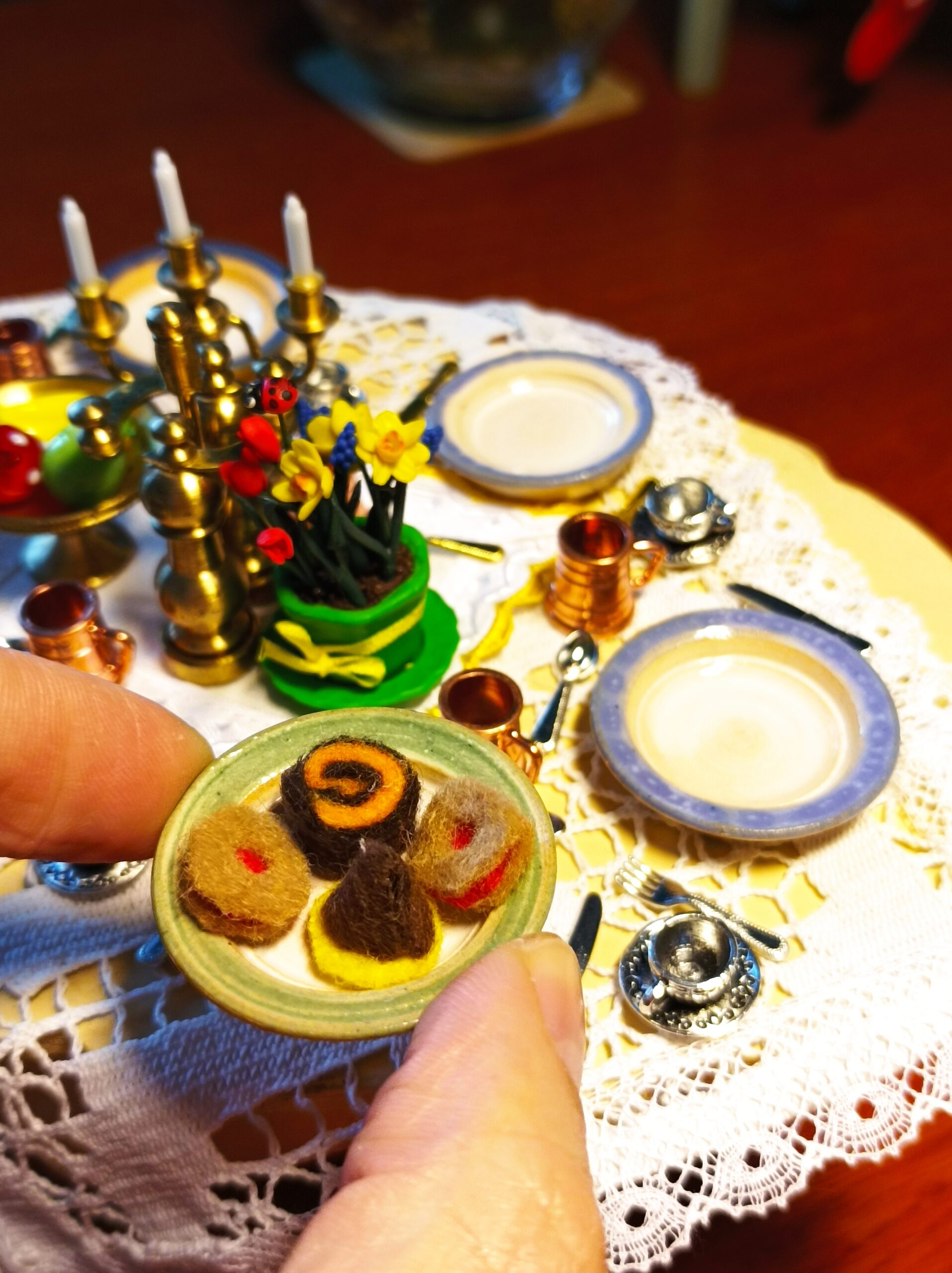 Cukroví je vyrobeno z filce. Na talířku je volně položeno.