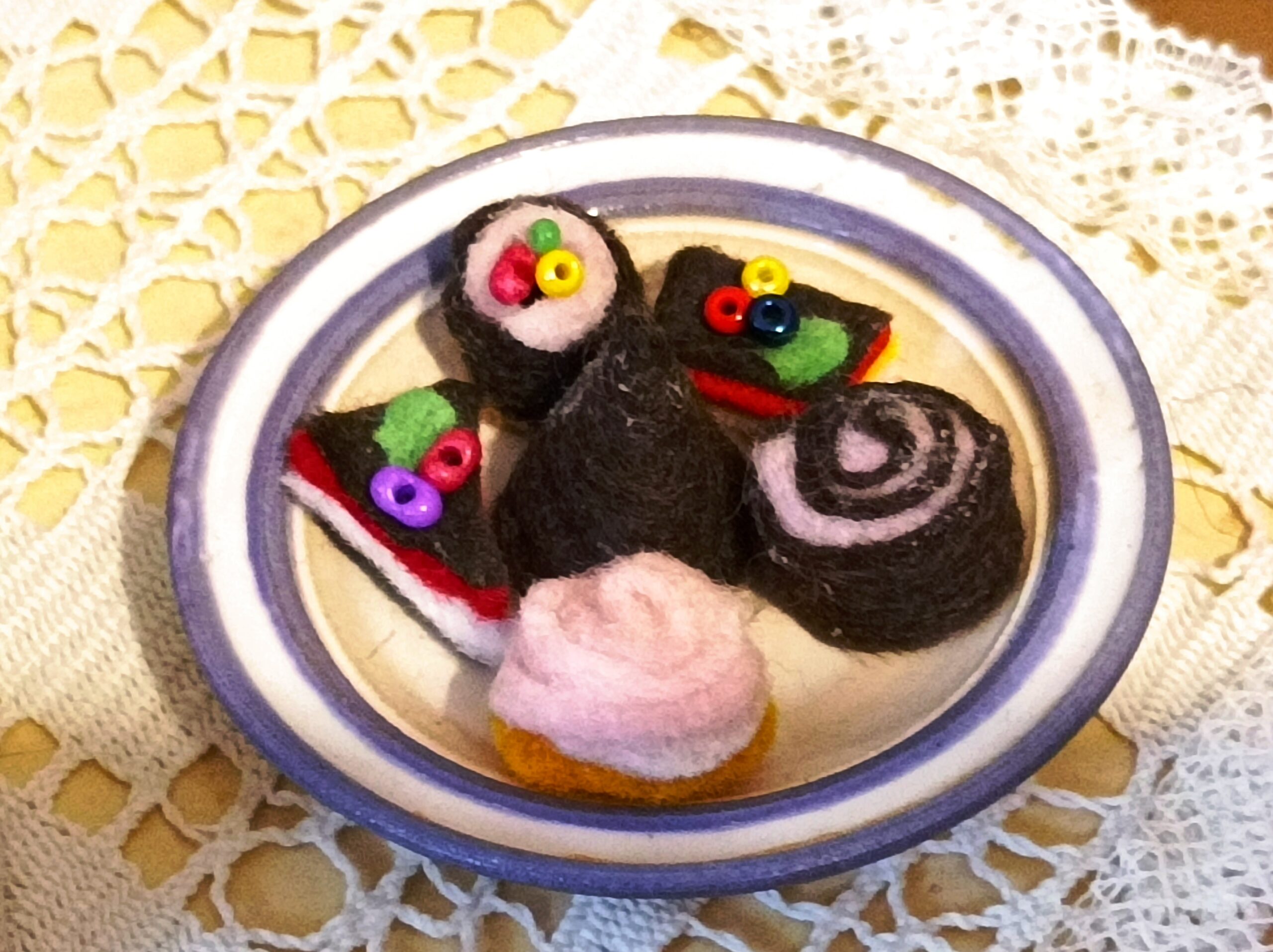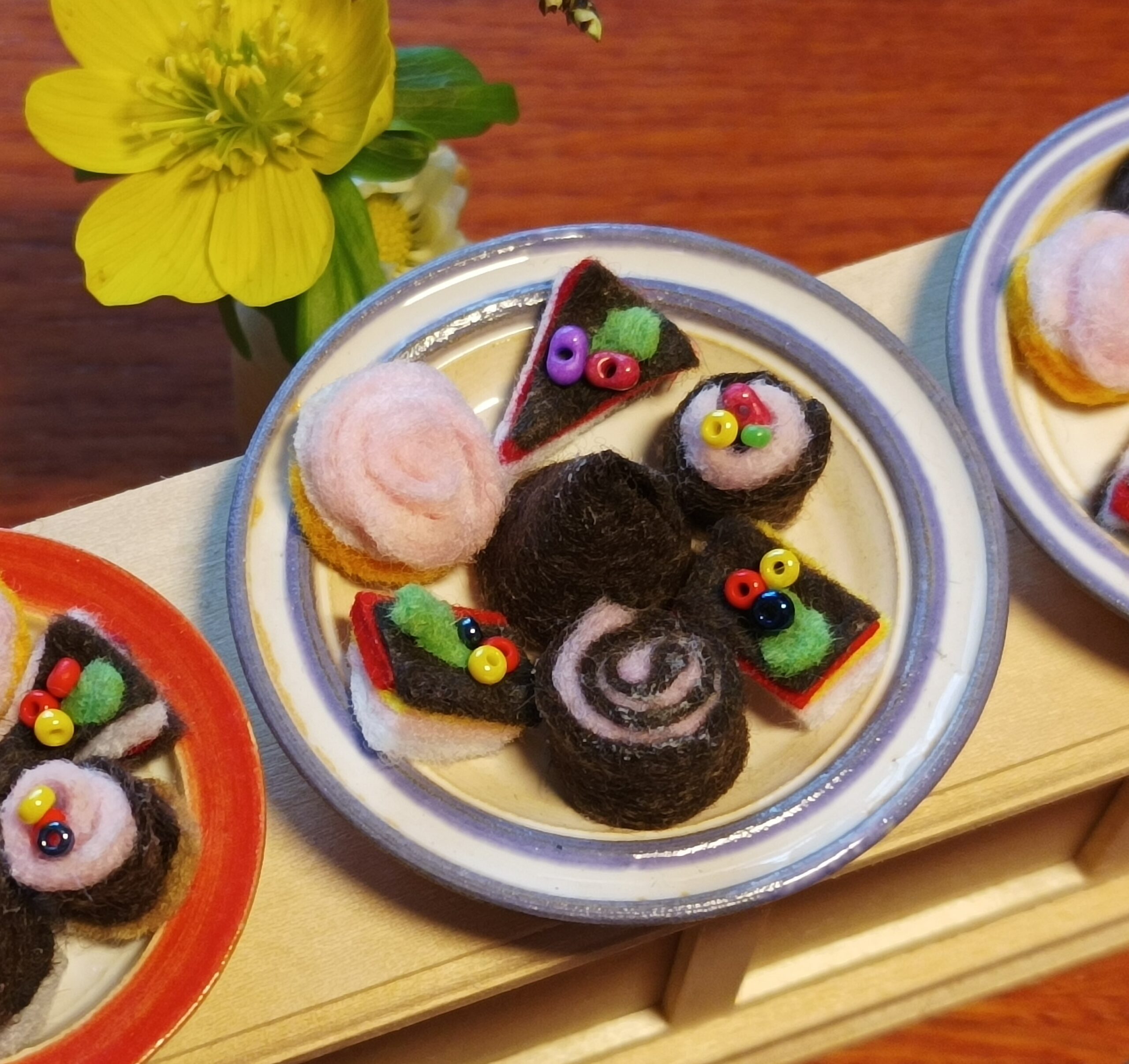 Dortíky jsou vyrobeny z filce. Na talířku jsou volně položeny.