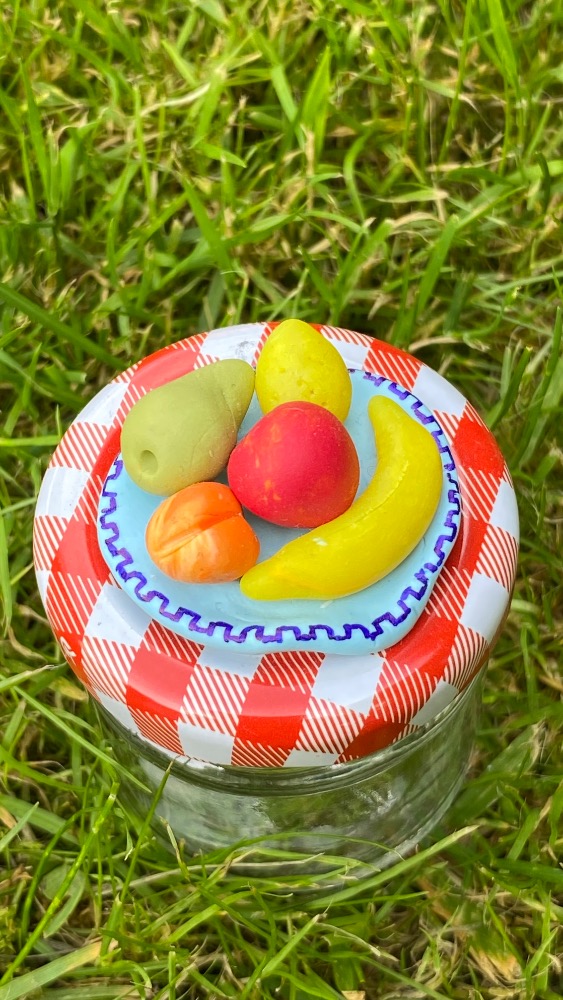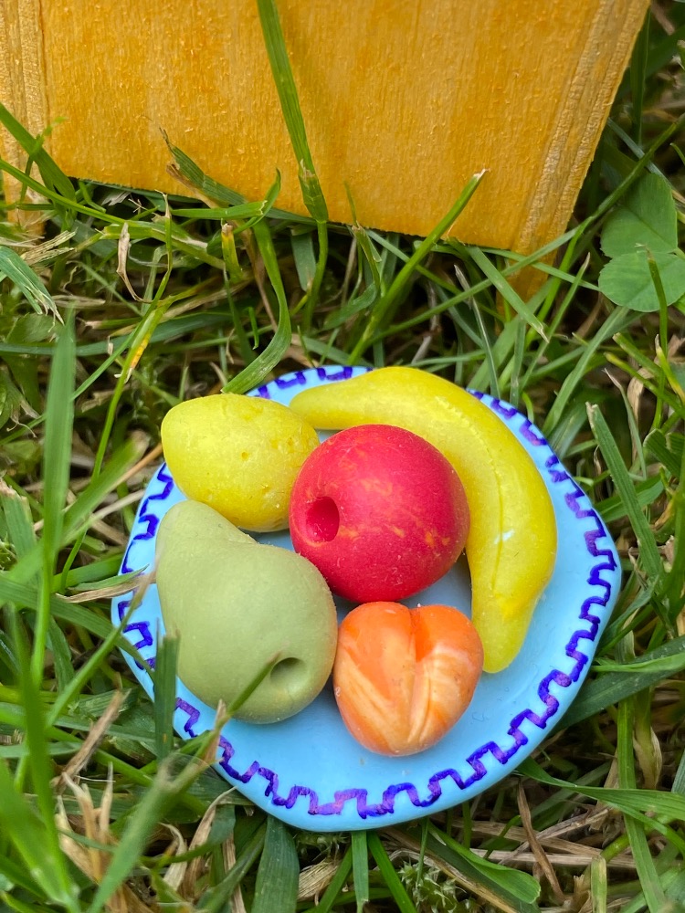 Talířek o průměru 3,3 cm, na kterém je napevno přilepena hruška, jablko, broskev, banán a citrón.