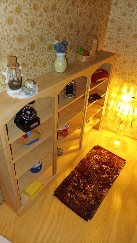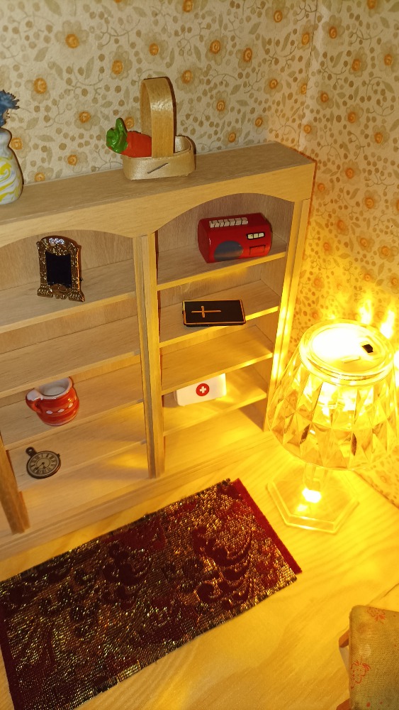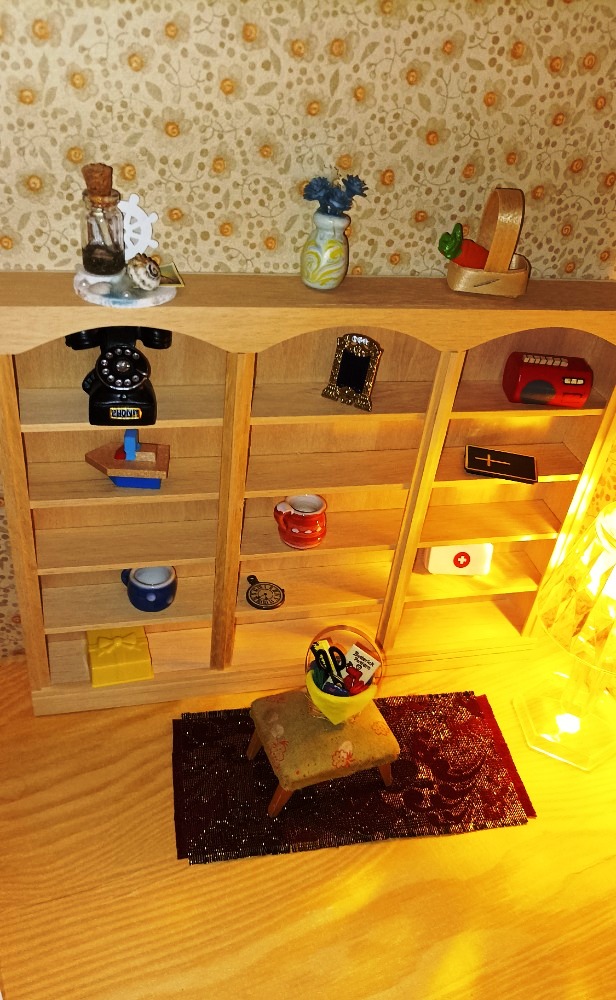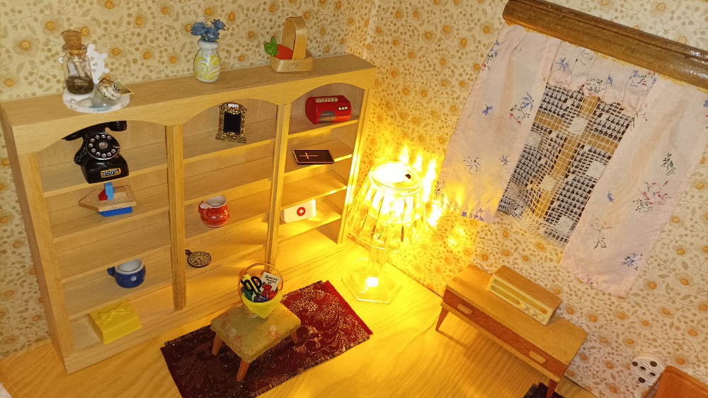 Výstavní koutek / Pokojíček K vlastnímu vytapetování, dozdobení a zařízení. Je to ten s koupelnou. délka: 28 cm výška: 20,5 cm poloměr: 31,2 cm materiál:…