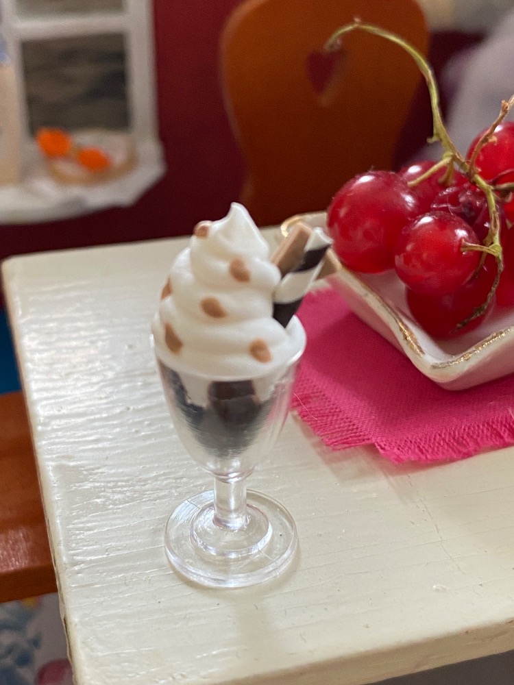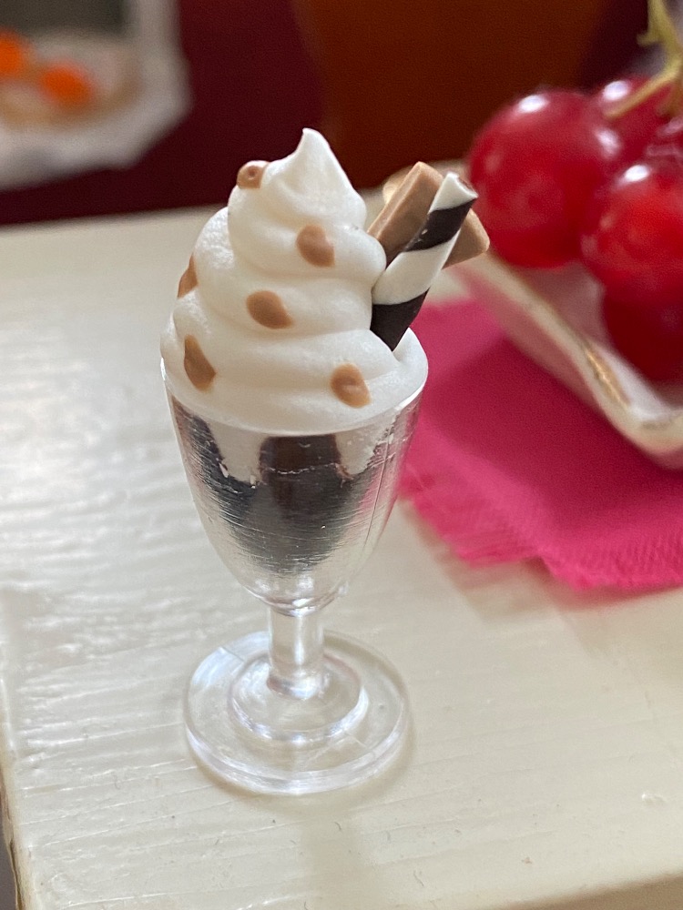 Pohár s čokoládou zmrzlinou, šlehačkou, oplatkou, trubičkou a sypáním.